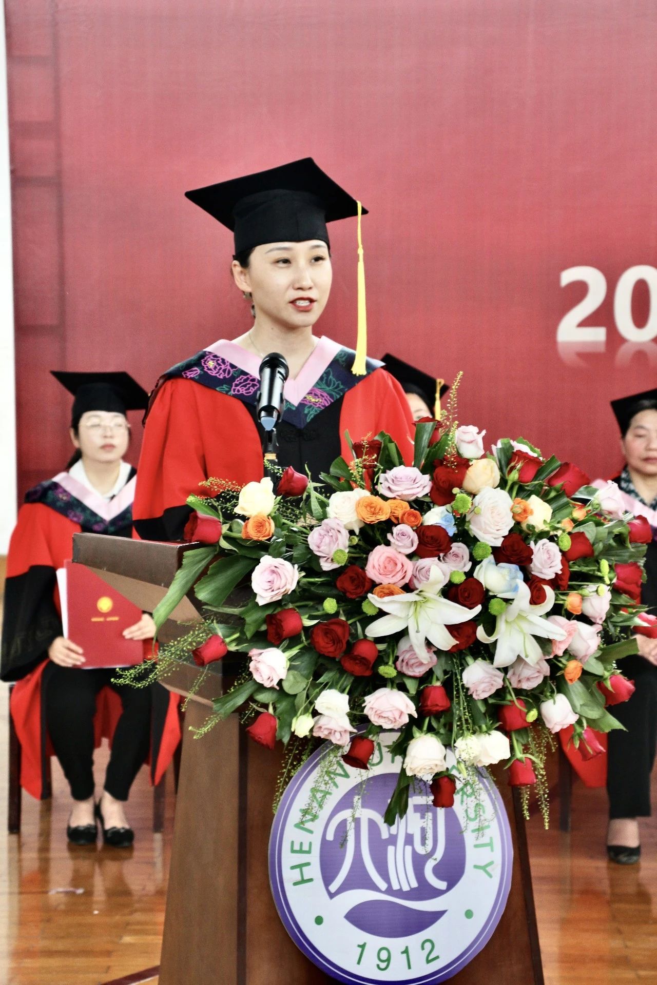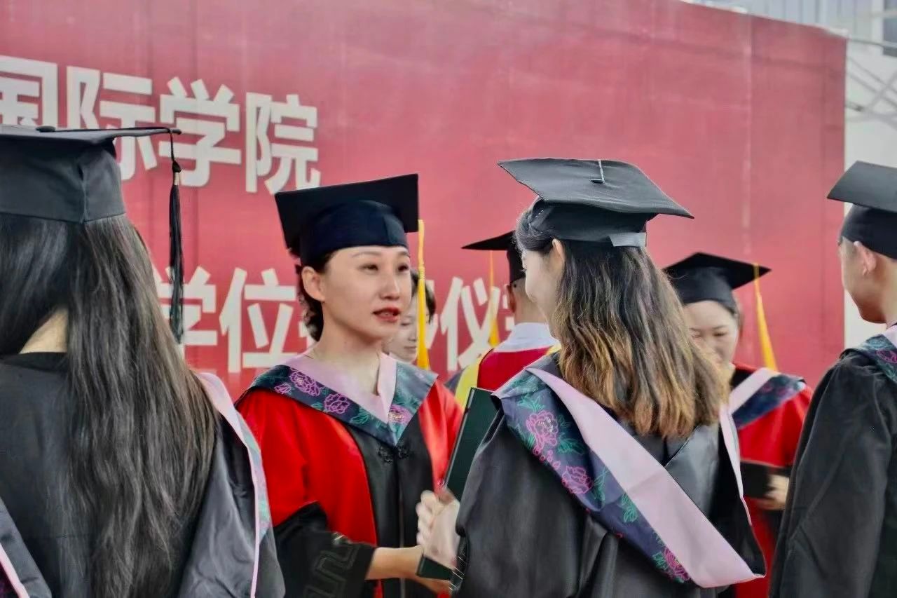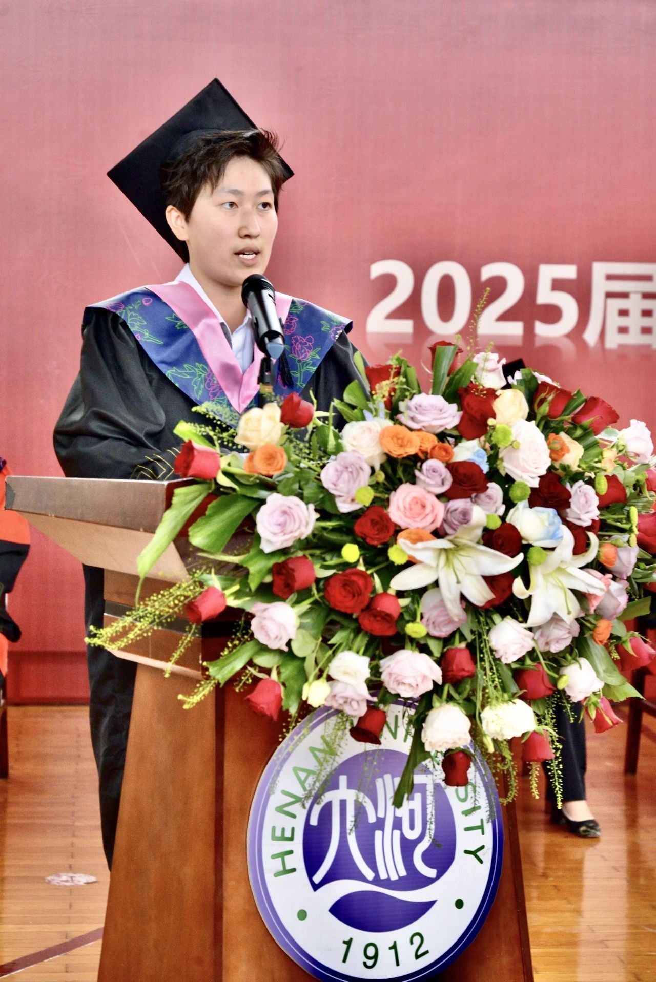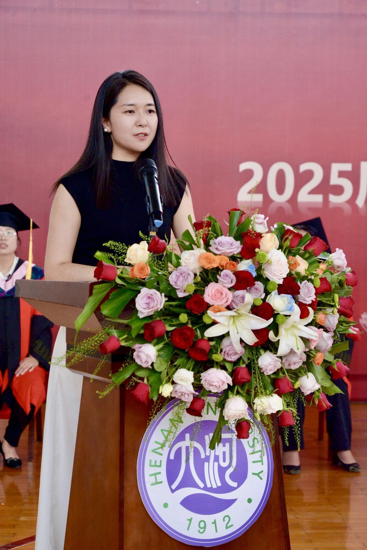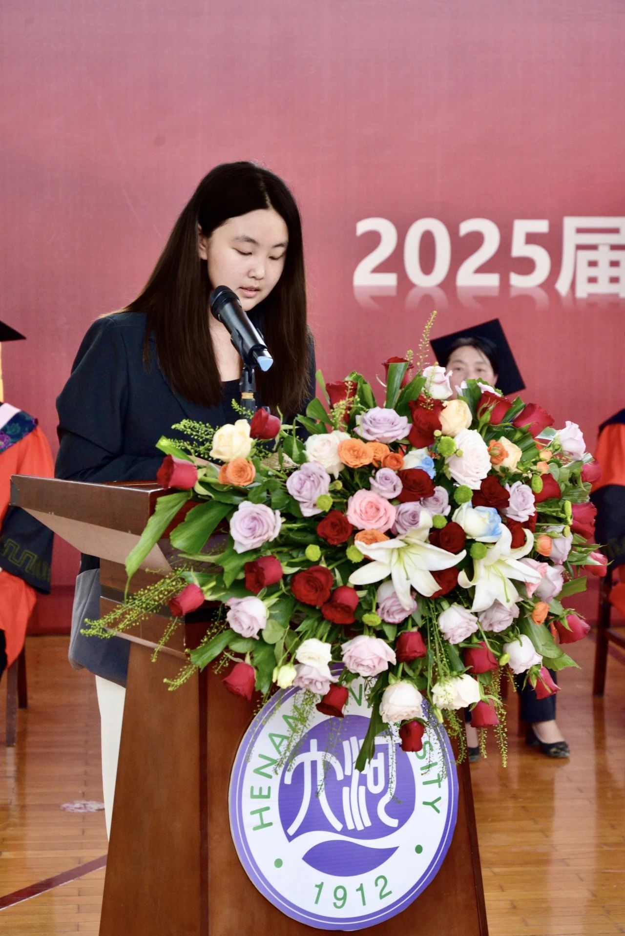刘佳明代表学院向毕业生表示热烈祝贺。她在致辞中深情回顾了同学们在校期间在学术研究、国际交流、文化传承等方面的精彩表现,充分肯定了他们以“开放、融合、创新、引领”的姿态,展现出的青春风采与责任担当。她勉励大家在人生新征程中,不仅要拥有热爱的事业,也要拥有温暖的生活,鼓励大家在人生道路上坚定追梦,奔赴星辰大海。