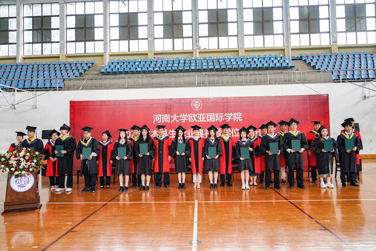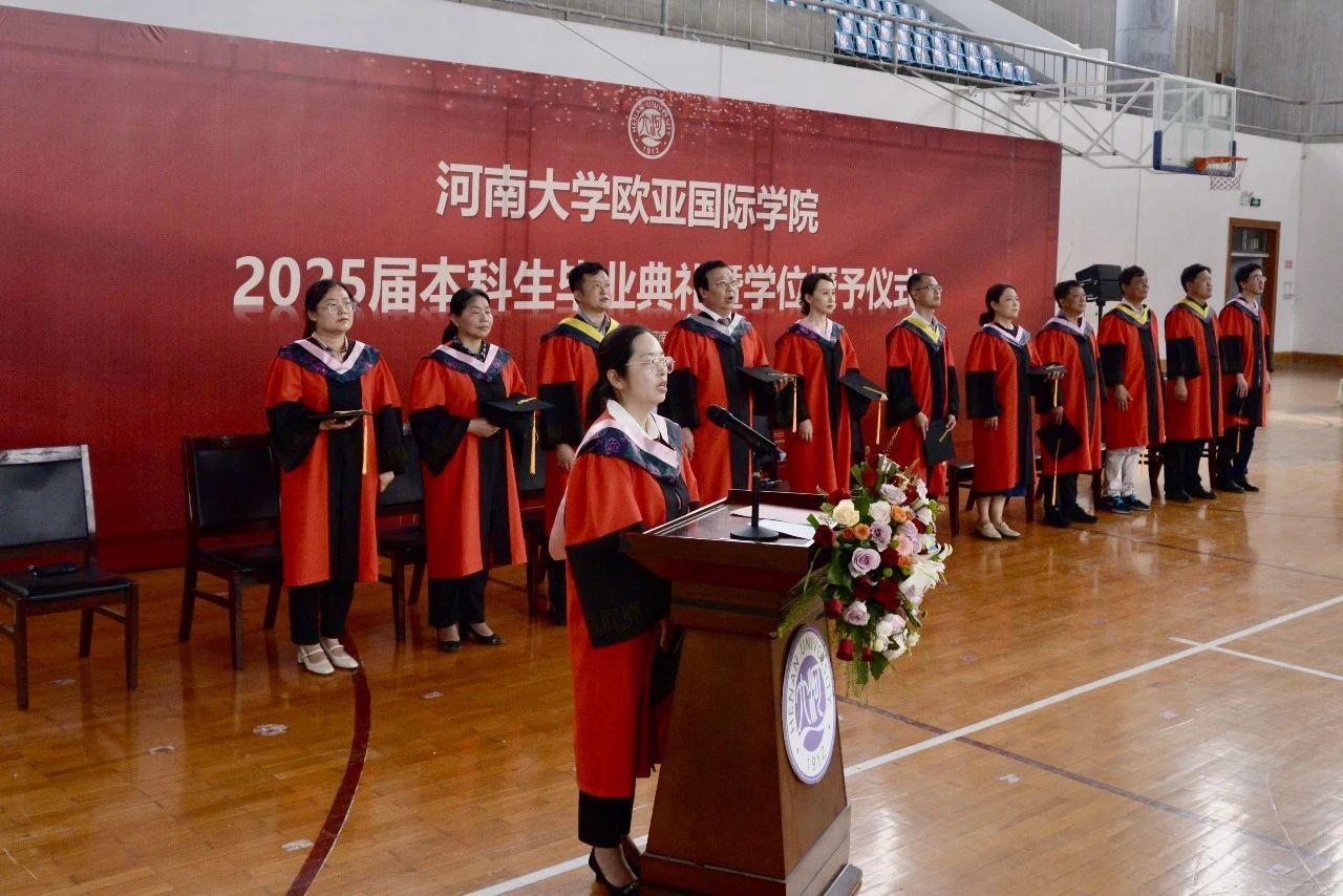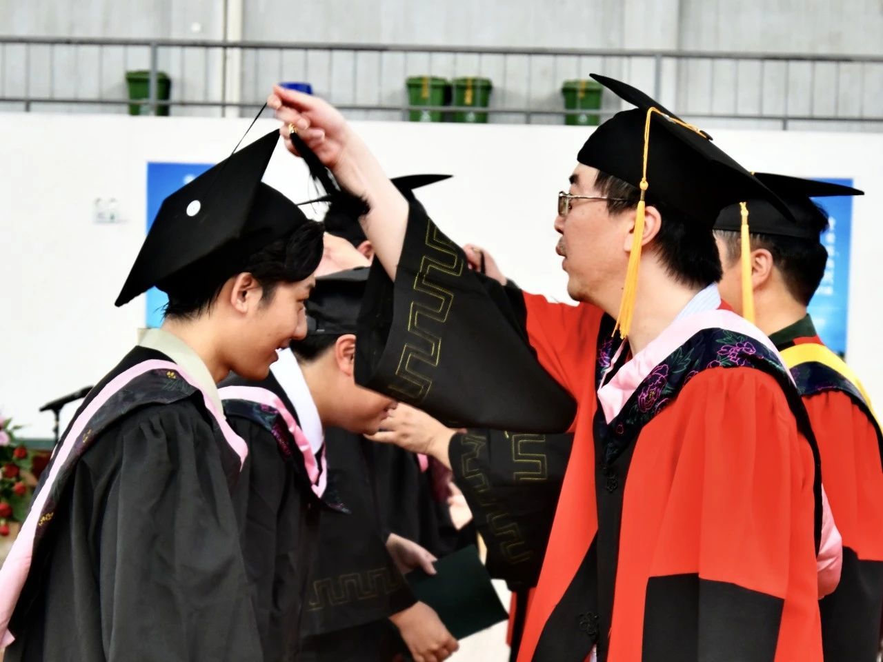 随后,主席台就座的老师们为2025届毕业生依次援正流苏,颁发学位证书,并合影留念,共同见证这一重要的时刻。