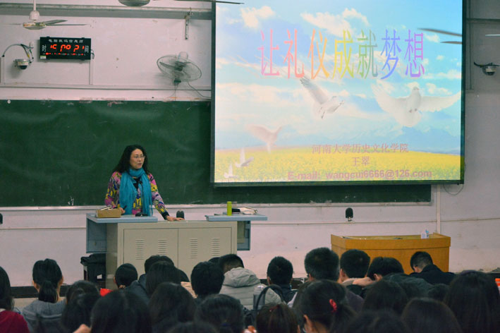 王翠教授首先讲解了礼仪对于中国民族的重要性、人际交往与沟通能力的重要性、大学生人际交往的正常状态。王翠教授指出,懂礼仪是做人的基础关键,人际交往与沟通能力是必备的一种素质,举出相应的事实案例证明观点;点明大学生人际交往水平普遍偏低的主要原因是不愿交往、不懂交往和不善交往。王教授强调人际交往是一个人成长和社会发展的必需,它是人际之间的一种互动。礼仪是交际的必然性要求,内在的文化素养为礼,行诸于外的言行举止为仪,内外兼修乃为礼仪。礼仪是一种高贵的品质,是我们每个人的追求,也是大学生对自身的一种完美。
