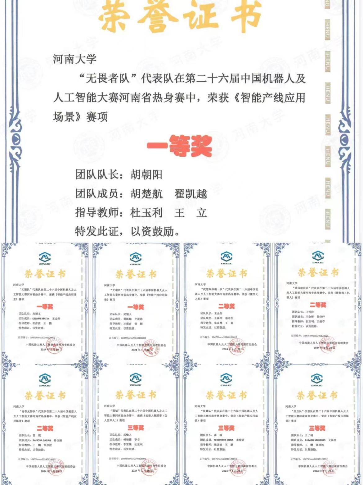 此次大赛汇聚了来自河南各地的优秀参赛选手,竞争异常激烈。西瓜视频 在本次大赛中表现出色,取得了优异成绩,来自2022级金融数学专业的胡朝阳同学在智能产线应用场景赛道取得一等奖,2023级播音与主持专业的蔡卓恒、王金彤同学和来自2022级金融数学专业的仝晨冰同学在无人机赛道中荣获二等奖。