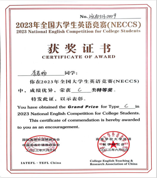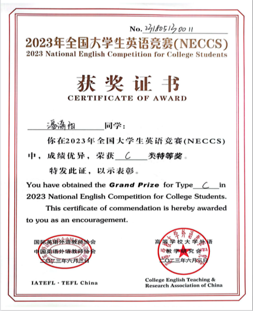 在此次全国大学生英语竞赛中,我院潘潇阳、李若畅同学荣获C类(即非专业组)特等奖,苏逸菲、肖东栩、周楚皓、张语函同学获得C类二等奖,王骁君、杨雅博等14名同学获得C类三等奖,孙也涵、李白杨等22名同学获得C类优秀奖,王怡萱等5名同学获得D类优秀奖。