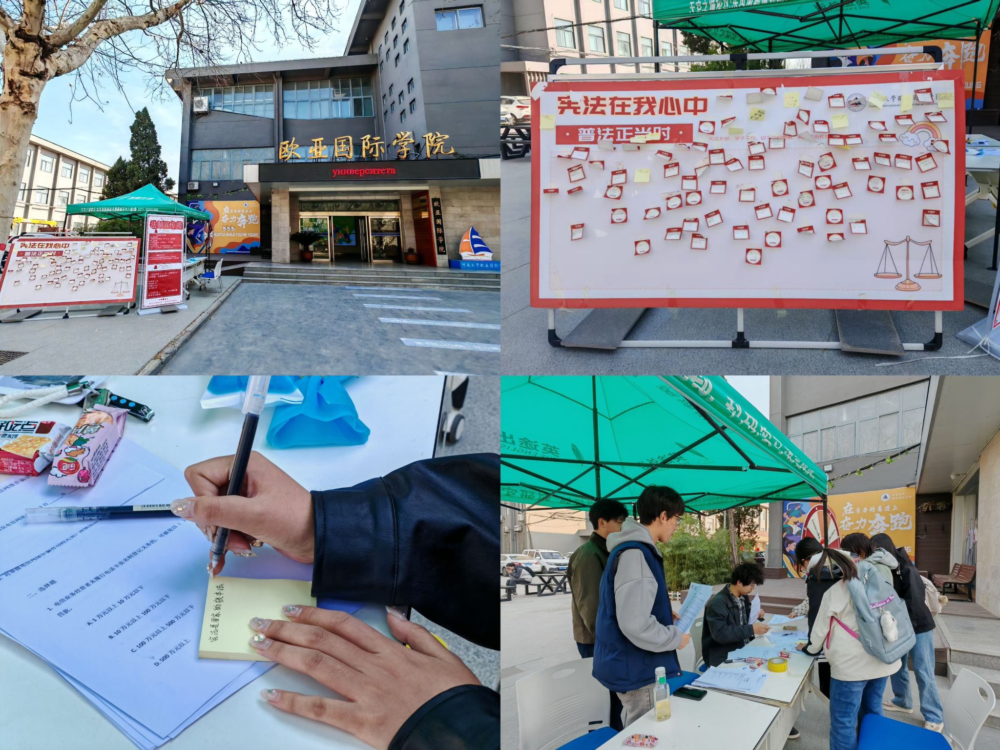 学院以“法治天地”主题活动为切入点,在学院门前小广场设置法治知识打卡点,通过基础题、必答题、抢答题等多样化形式,吸引近300名师生参与。活动现场,90%的参赛者能够准确回答基础法律问题,展板成为师生热议焦点,充分展现大家扎实的法治知识储备与积极的学习态度。活动中同学们专注答题、热烈讨论的场景,生动诠释了“尊法学法守法用法”的浓厚氛围。