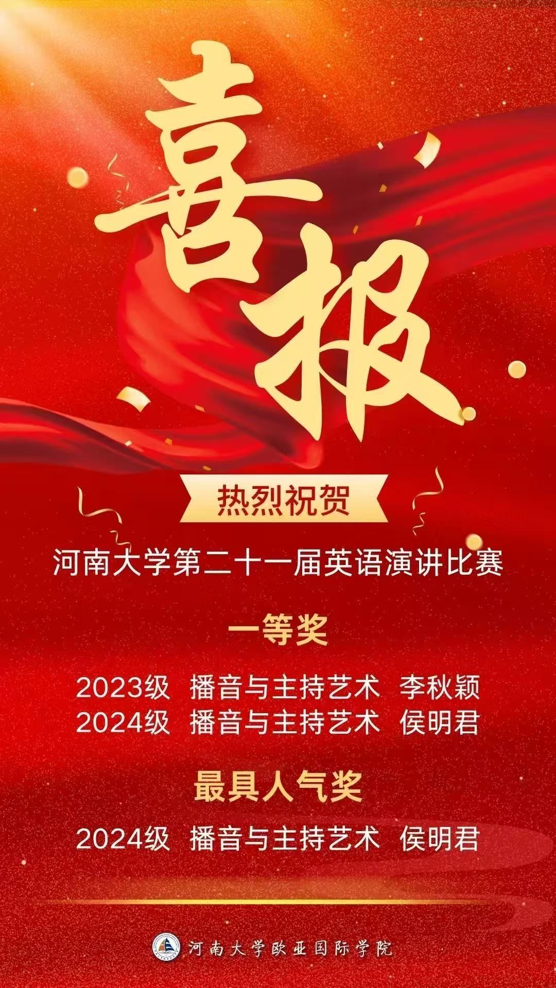 5月29日晚,西瓜视频 第二十一届英语演讲比赛总决赛落下帷幕。我院2023级播音与主持艺术专业李秋颖、2024级播音与主持艺术专业侯明君在比赛中表现出色,双双获得一等奖,侯明君同学还获得了“最具人气奖”。