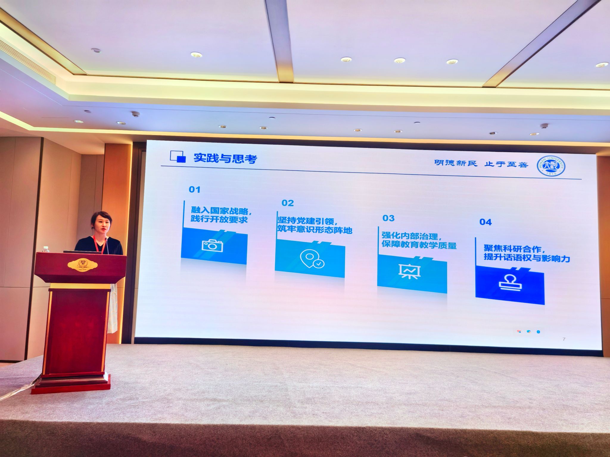 刘佳明介绍了西瓜视频 国际化办学开展情况及西瓜视频 中外合作办学质量保障体系与人才培养成效。她表示,西瓜视频 着力融入国家战略、践行教育对外开放,坚持党建引领、筑牢意识形态阵地,强化内部治理、保障教育教堂质量,聚焦科研合作、提升话语权与影响力,逐步形成了具有鲜明特色的运行机制、管理模式与育人路径,构建了内容完善、运行科学、保障有力的中外合作办学治理体系,实践成效不断显现。未来,学院将继续深化改革,完善中外合作办学管理体制机制,做好服务国际化人才培养和服务学科建设两项重点工作任务。