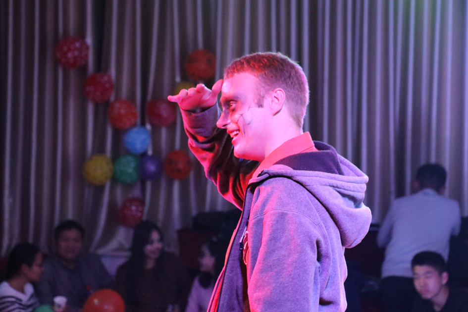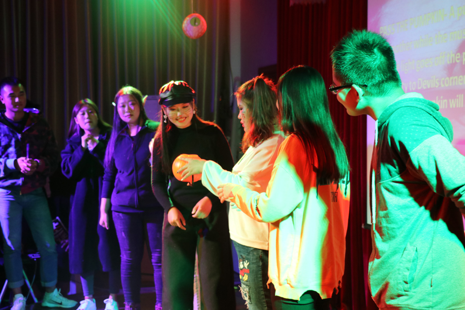 活动一开始,经过精心打扮的外教粉墨登场,恐怖又有点可爱的造型不仅让大家看到了与平日不一样外籍教师形象,也对这次活动内容充满了期待。像所有同学们所期待的那样,本次活动是以游艺晚会的形式展开的,活动开始后,外教们精心准备的小游戏依次登场,soul grabbing, passing the pumpkin, three legged race, balloon smashing, truth or dare, gold coin hunting, scavenger hunt.这些新颖而富有创意的游戏无一不博得大家的眼球,吸引大家踊跃上台,积极参与。台下的观众也随着游戏的节奏,为他们欢呼鼓掌。