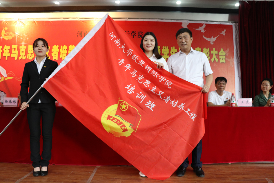 “青马工程”开班仪式上,学院党委副书记楚艳霞宣读了《青年马克思主义者培养工程第一期培训班工作实施办法》,从学员产生办法、课程安排、班委组成、学习要求等方面对本期培训班进行了安排和部署。学院党委书记谷跃峰向本期培训班班长周亚文、副班长王瑜授班旗。学员代表2015级播音与主持艺术崔莞婷同学发言,表达了立志学习践行马克思主义、至诚报国、对党忠诚的决心。随后,全体学员在团委学生副书记周亚文的领誓下,进行了“重温入团誓词”集体宣誓,表达了牢记入团誓言,树立远大理想,争做时代先锋,恪守河大校训,共同建设“双一流”大学决心和信心。