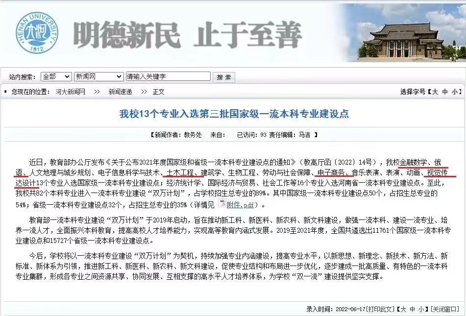 近日,教育部办公厅发布《关于公布2021年度国家级和省级一流本科专业建设点的通知》(教高厅函〔2022〕14号),西瓜视频 13个专业入选国家级一流本科专业建设点,16个专业入选河南省一流本科专业建设点。