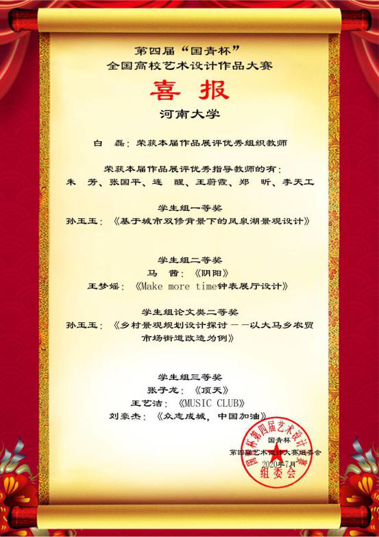 我院学子在此次比赛中共斩获7个奖项。其中,2016级环境设计专业孙玉玉的环境空间(景观)作品《基于城市双修背景下的凤泉湖景观设计》,获学生组作品类一等奖;2017级环境设计专业马茜作品《阴阳》、2017级环境设计专业王梦媱作品《Make more time钟表展厅设计》获学生组作品类二等奖、2016级环境设计专业学子孙玉玉的《乡村景观规划设计探讨——以大马乡农贸市场街道改造为例》获学生组论文类二等奖;2019级视觉传达专业学子张子龙的视觉传达类(海报)作品《顶天》、2019级视觉传达专业王艺洁的视觉传达类(海报)《MUSIC CLUB》以及2019级视觉传达专业刘豪杰的视觉传达类(海报)作品《众志成城,中国加油》分别获得了三等奖。