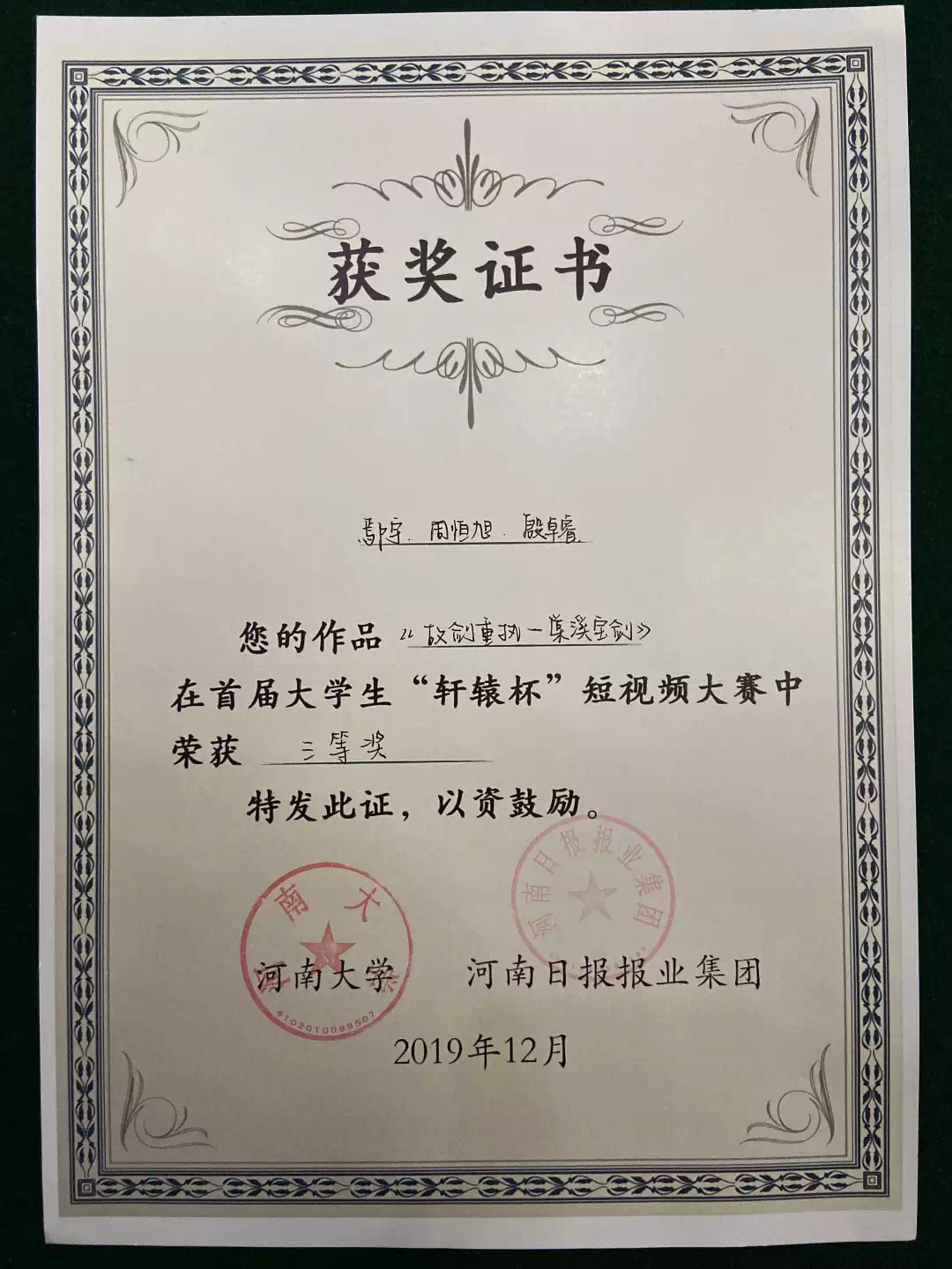 经过初审、终审,此次大赛共有22部作品分获等级奖,19部作品获优秀奖。其中,来自西瓜视频 16级播音与主持艺术专业的鄢宇同学及其团队成员周恒旭、殷卓睿在“轩辕杯”短视频大赛中荣获三等奖。