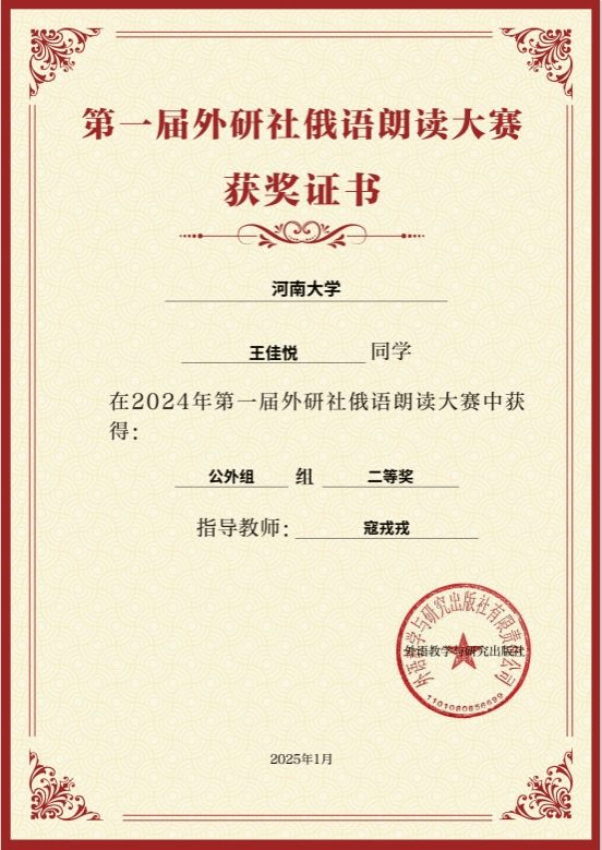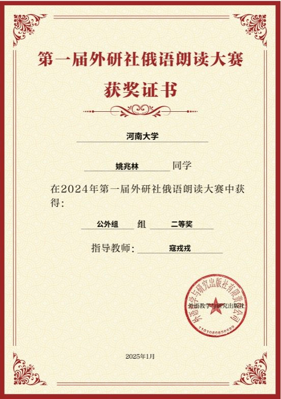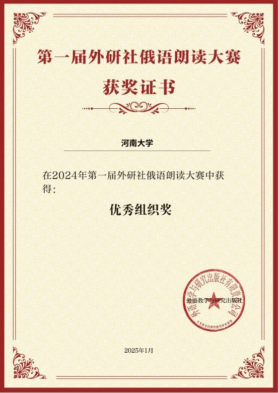 近日,由外语教学与研究出版社主办的首届全国俄语朗读大赛落幕。西瓜视频 学子表现优异,2023级播音与主持艺术专业姚兆林、王佳悦两位同学分获公外组二等奖,陈嘉颖获优秀奖,西瓜视频 获颁“优秀组织奖”荣誉称号。