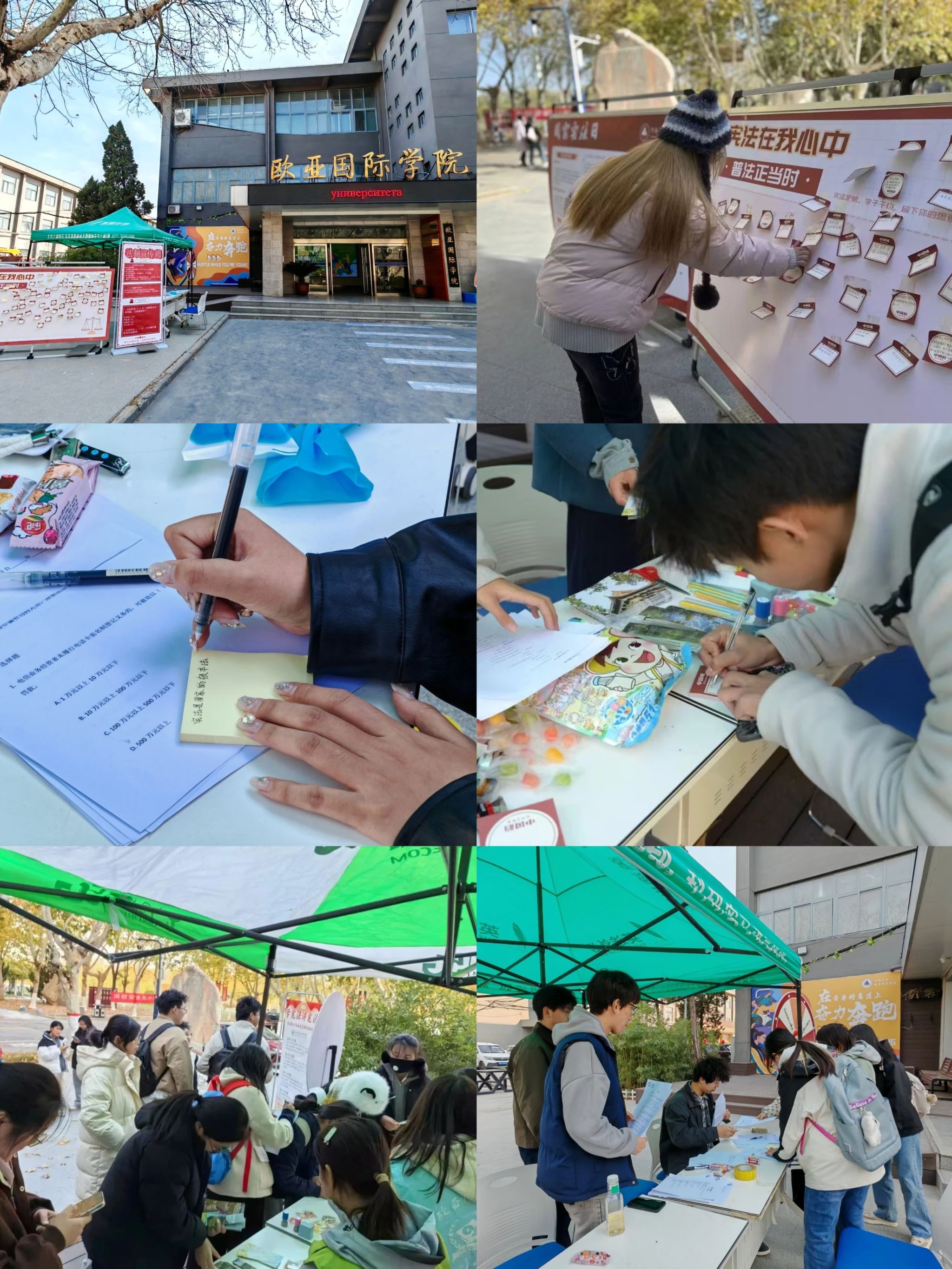 学院以“法治天地”主题活动为切入点,在学院门前小广场设置法治知识打卡点,通过基础题、必答题、抢答题等多样化形式,吸引近300名师生参与。活动现场,90%的参赛者能够准确回答基础法律问题,展板成为师生热议焦点,充分展现大家扎实的法治知识储备与积极的学习态度。活动中同学们专注答题、热烈讨论的场景,生动诠释了“尊法学法守法用法”的浓厚氛围。