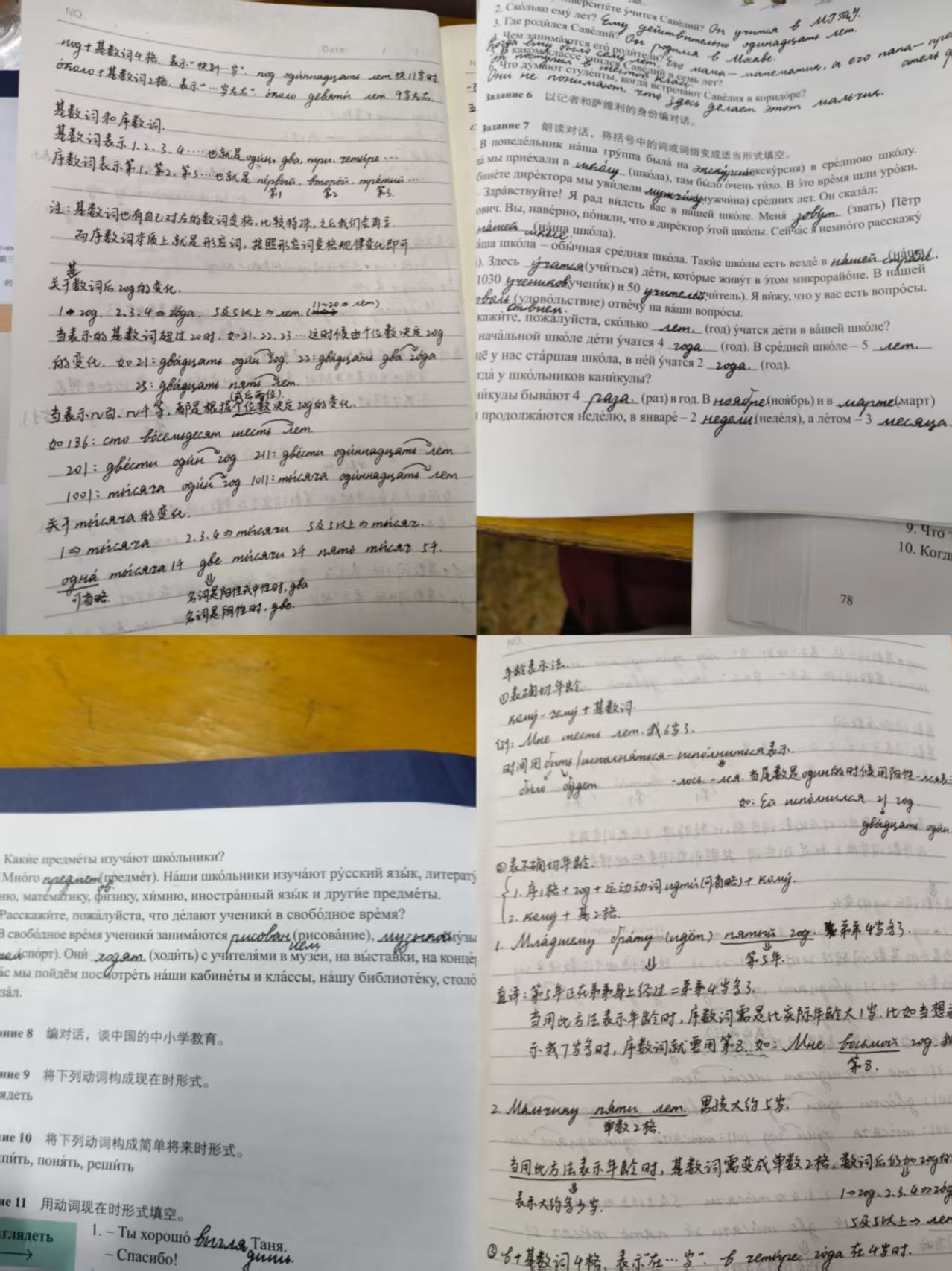 刚开始学俄语时发现这和自己想的很不一样,最直观的感受就是很难,特别难。很多复杂的变化让我感到无比的头大。记得有一次老师留了五十多道的习题,刚开始写的时候信心满满,耗了很长时间才写完,当时感觉自己特别厉害很有成就感,结果对答案的时候只对了十道左右,八成左右都是写错的,一下子就感到了崩溃和无力,吐槽着俄语太难,甚至有点后悔选了俄语。不过现在学的多了一点,练的也多了一点,也就慢慢地改善了一点。