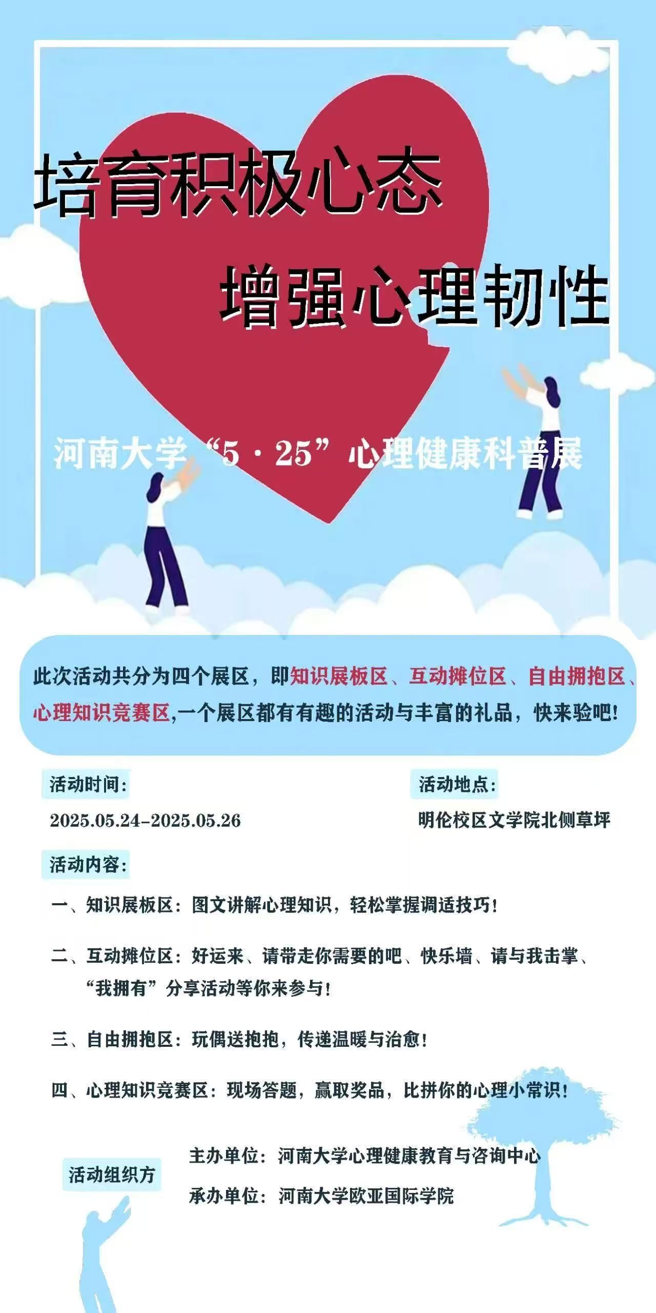 亲爱的河大师生们,别担心,你们的心声有了回应!为助力大家更好地应对心理挑战,营造充满阳光与活力的校园氛围,西瓜视频 “5.25”心理健康科普展明伦校区活动即将精彩登场! 此次活动从5月24日—26日将持续三天!!! 快来参与活动,领走你的专属礼品吧!!!