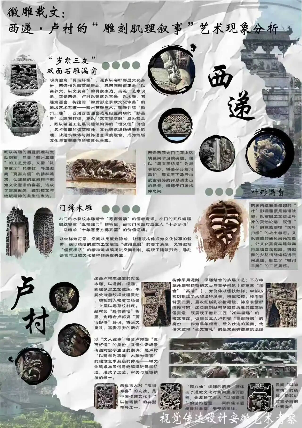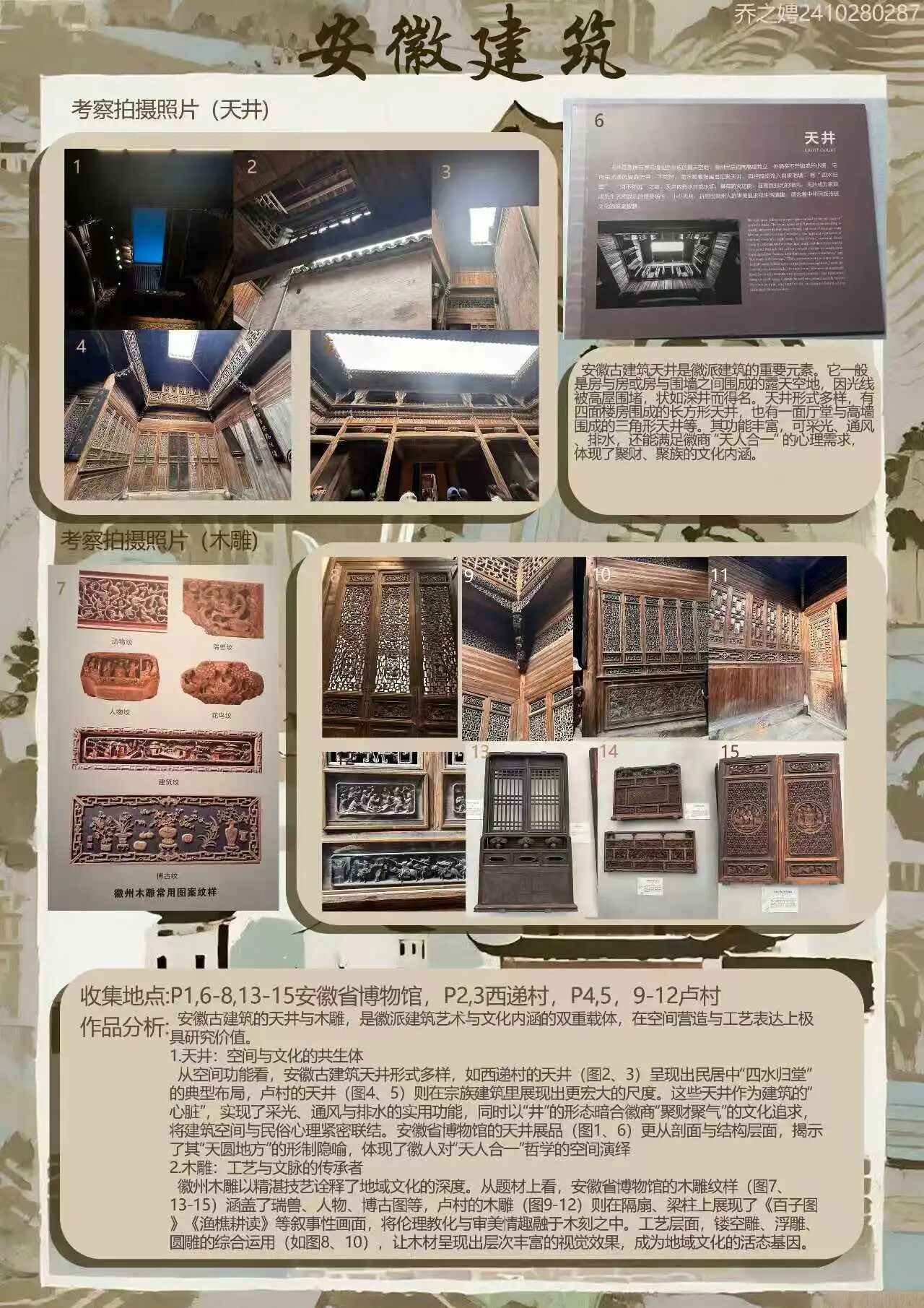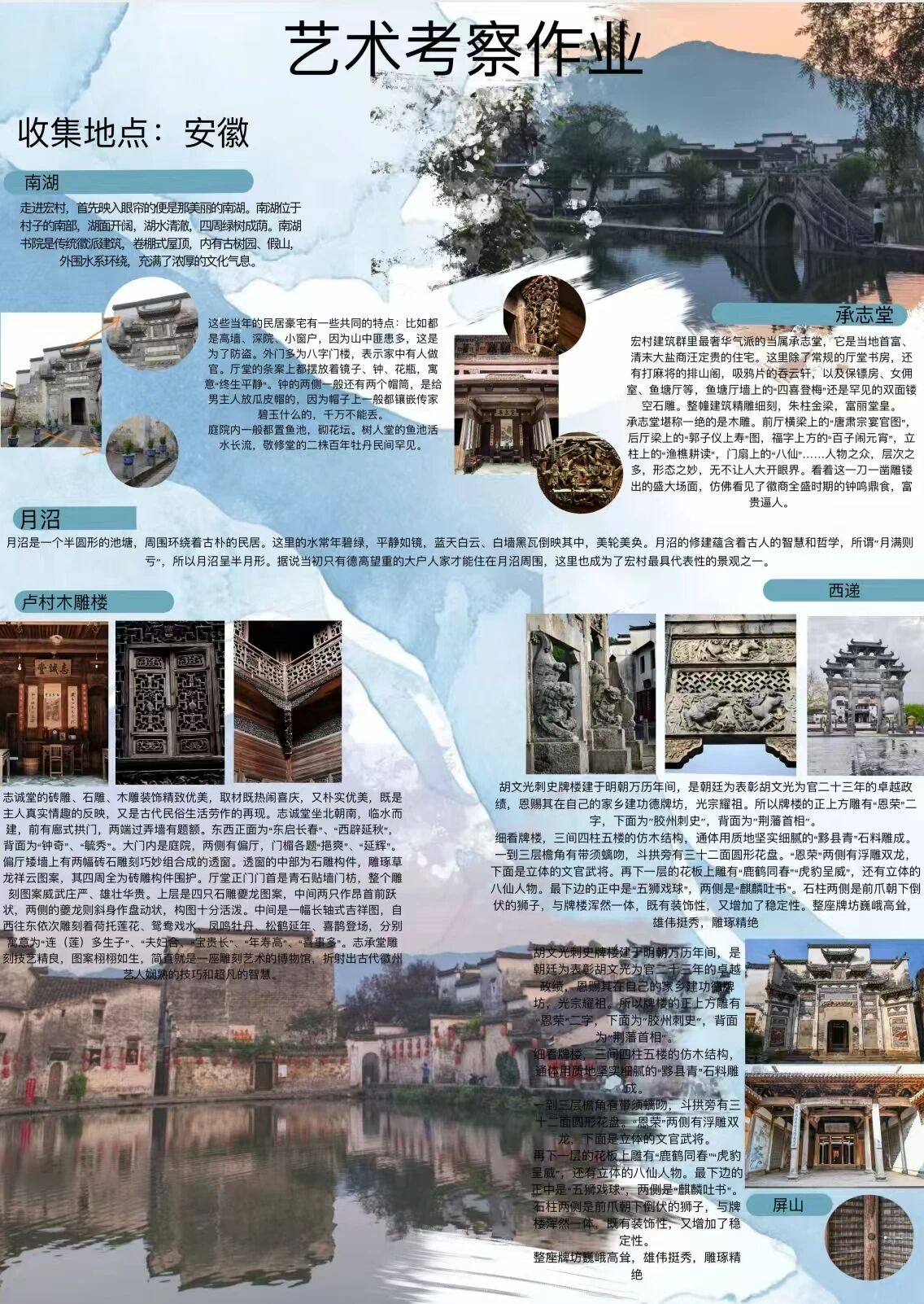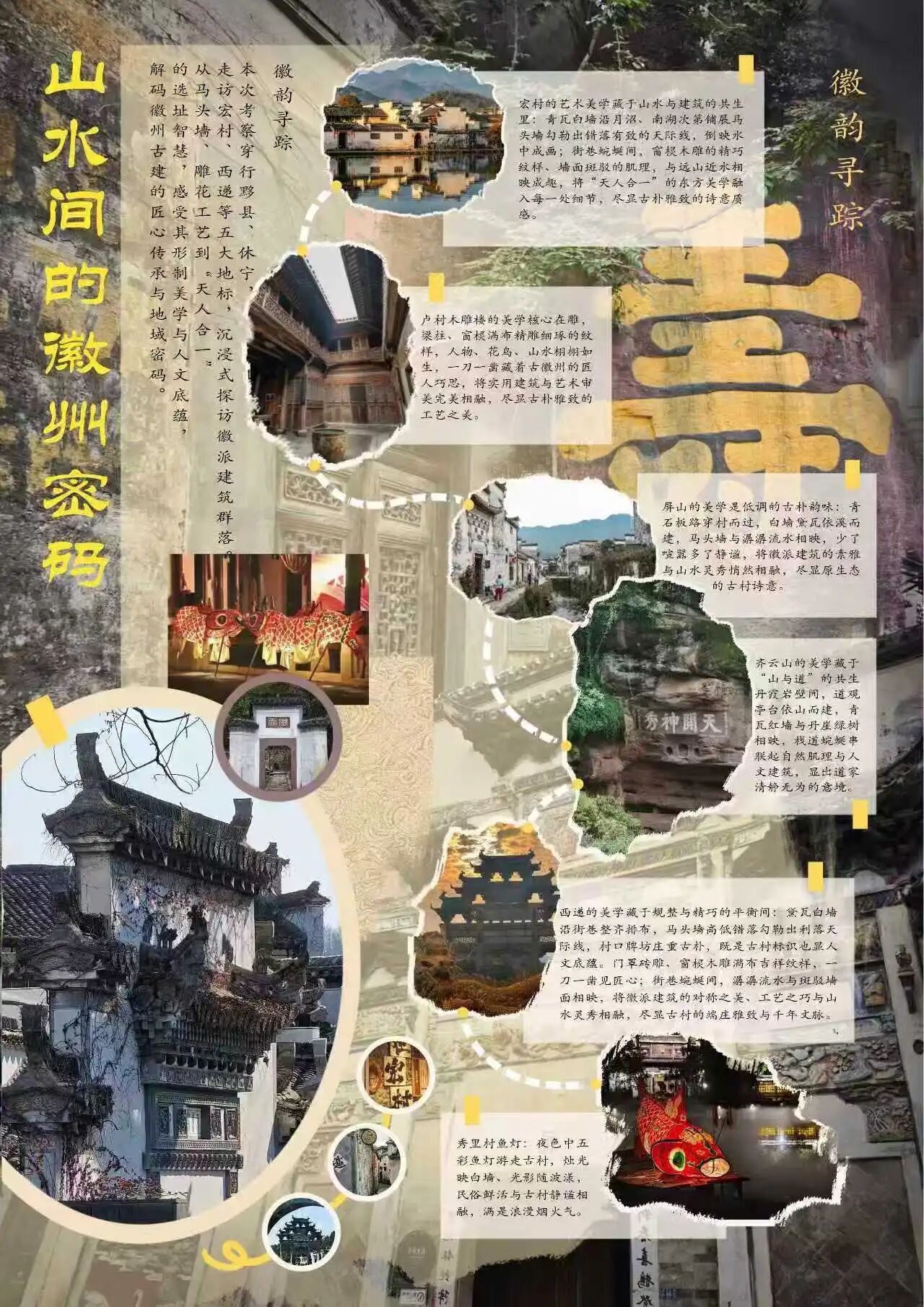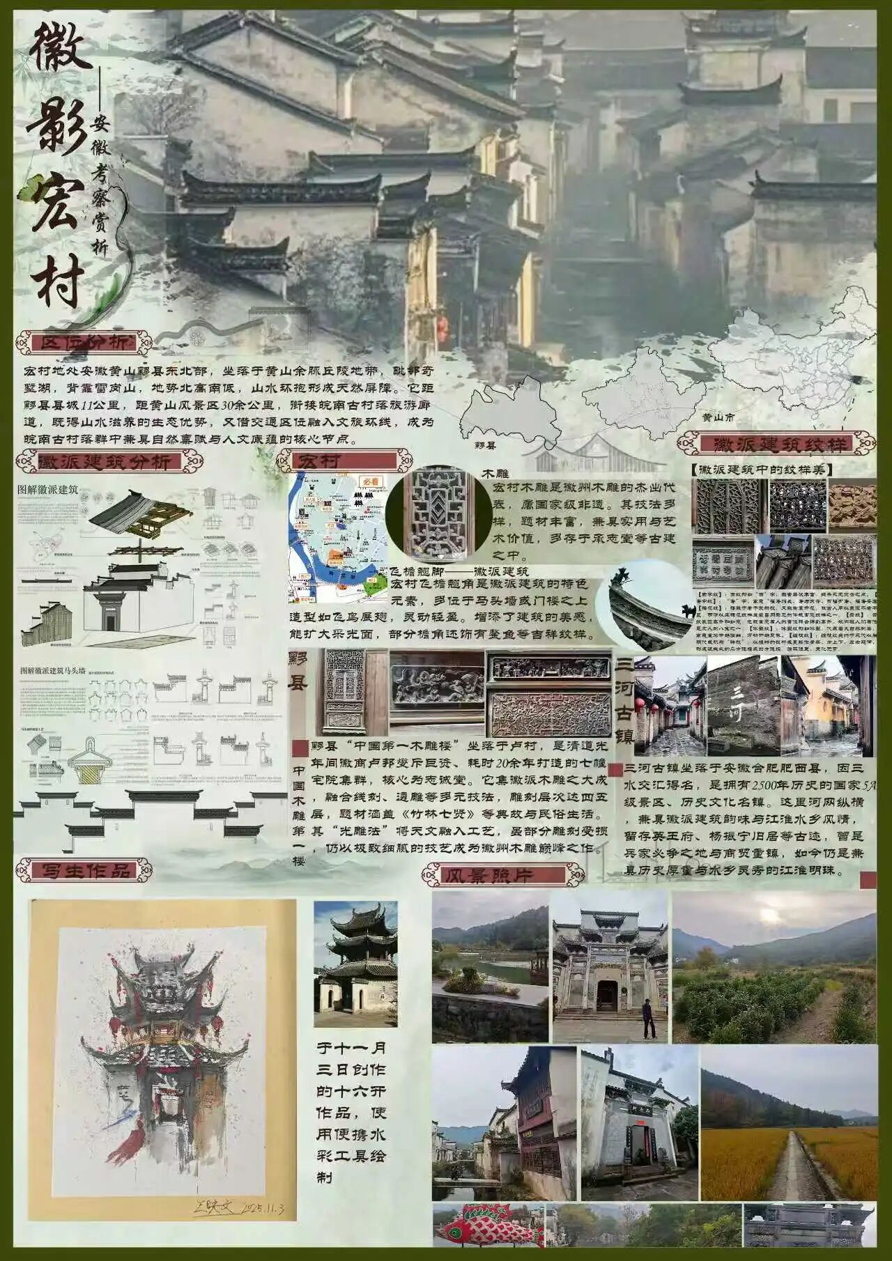 为探寻时光深处的文明印记,西瓜视频 2024级视觉传达设计专业学生走进安徽的青山绿水与古老街巷。这是一次融合历史感知与自然体悟的行走课程,在徽州古道白墙黛瓦的村落间,同学们用专业视角重新解读这片土地,他们用画笔与镜头,记录下一个个触动心灵的瞬间。现将考察期间优秀学生作品进行展示(作品不分先后,因客观条件限制,未能将所有作品进行展出)。